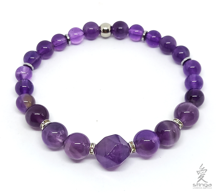 Nádherný náramok z ametystu je ozdobený štrasovými rondelkami, diskami z hematitu a guľočkou z chirurgickej ocele
