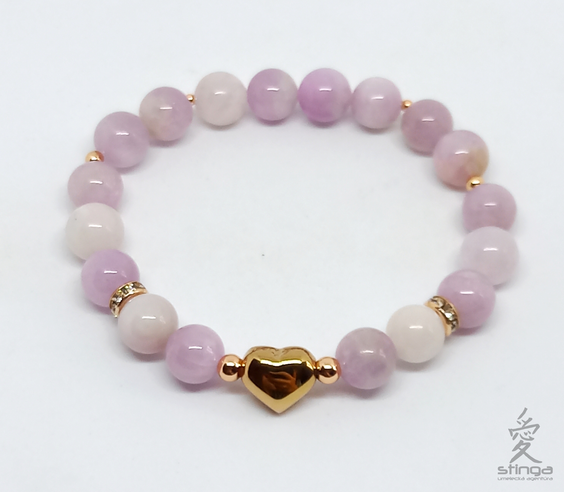 Luxusný náramok z nádherného kunzitu zdobí srdiečko a mini guličky z ružovej chirurgickej ocele a trblietavé ružové štrasové rondelky