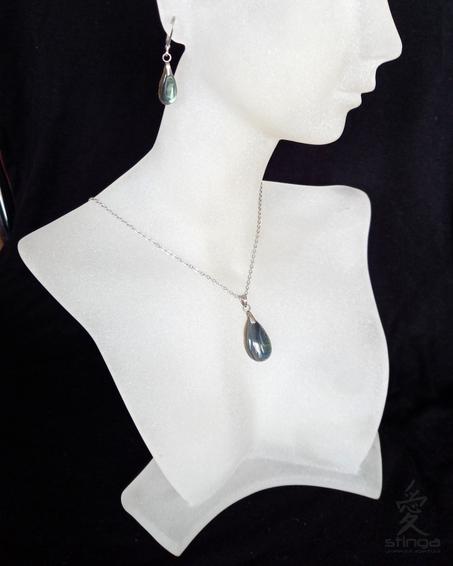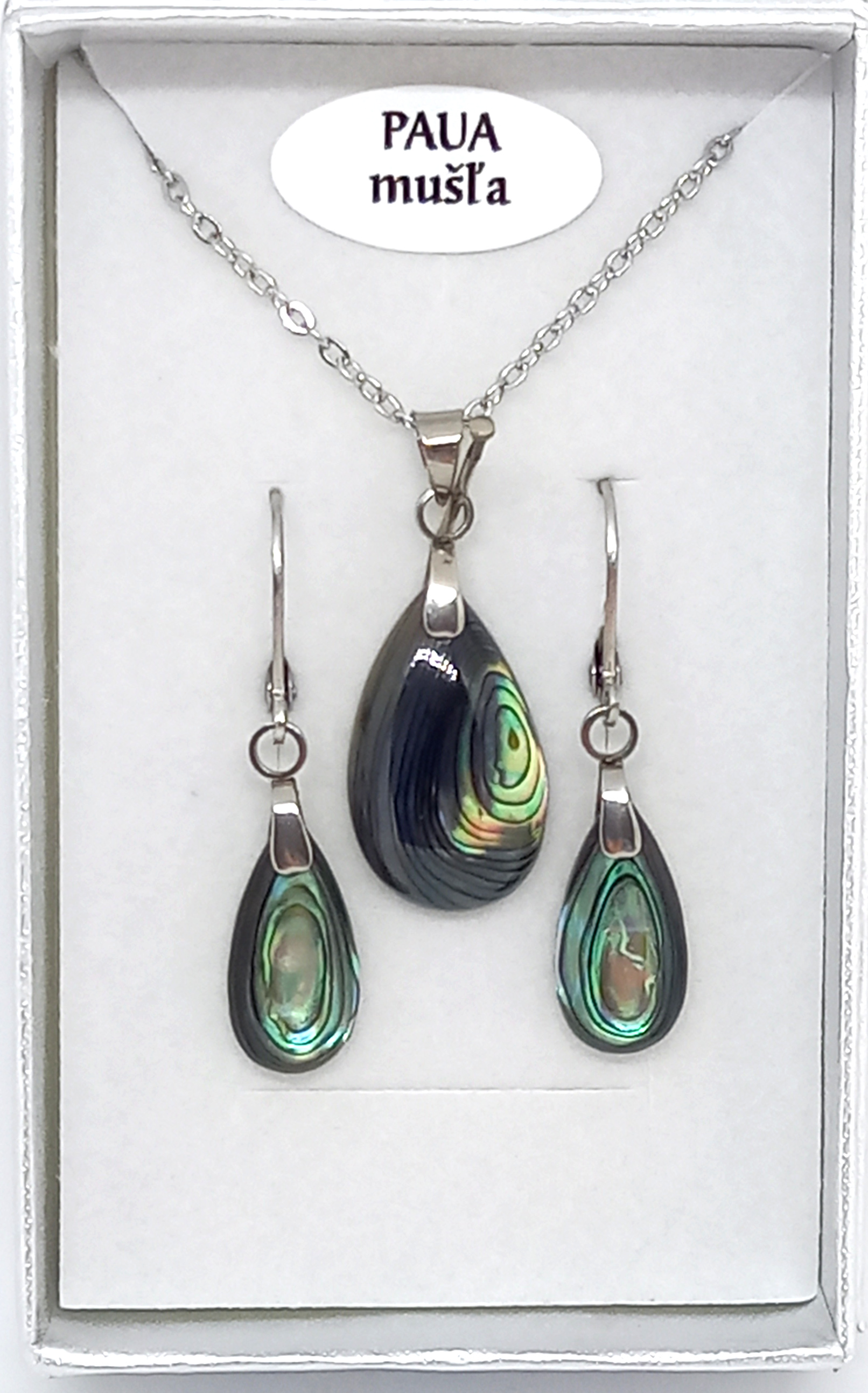 Krásna sada z obľúbenej a vyhľadávanej paua mušle . Prívesok je zavesený na retiazke z chirurgickej ocele, náušnice majú uzatvárateľné ušká z chirurgickej ocele. Sada je balená v darčekovej krabičke bielej farby 8x8cm.