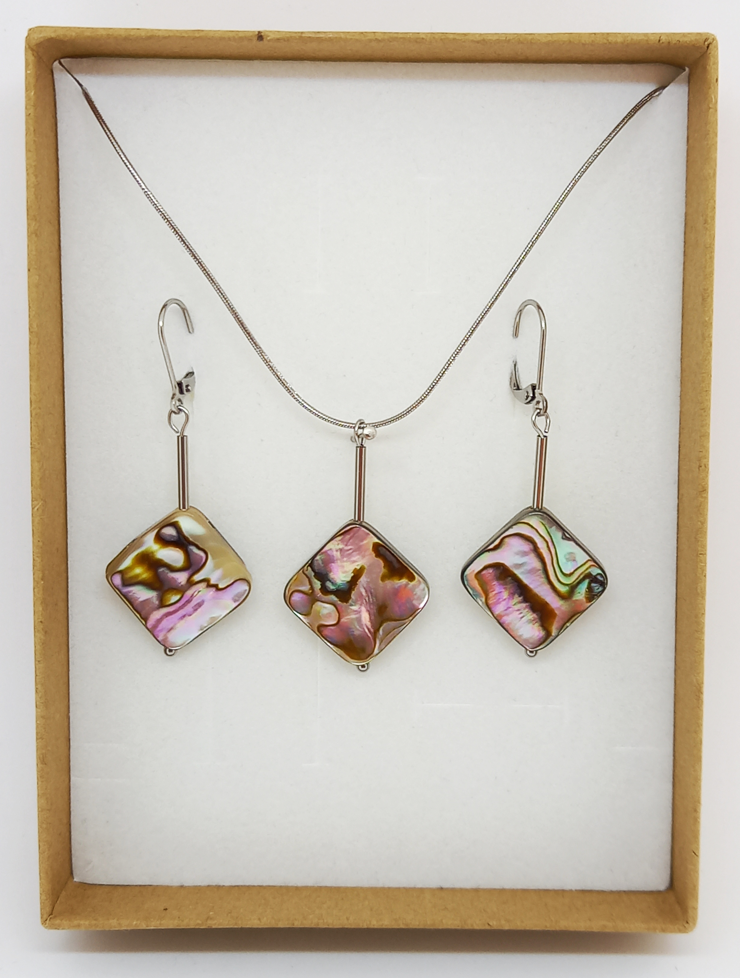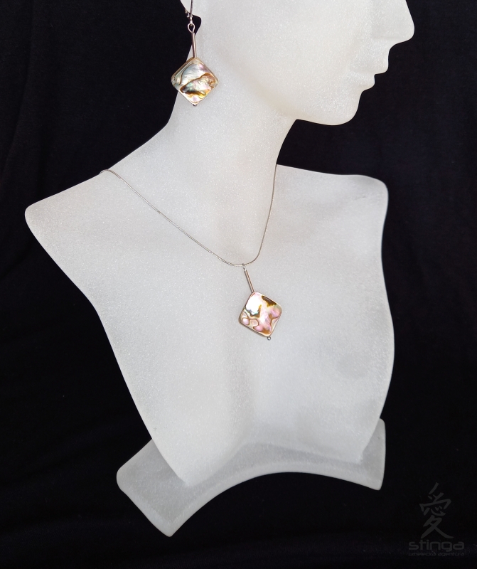 Exkluzívna sada z obľúbenej a vyhľadávanej paua mušle . Prívesok v tvare štvorca je zavesený na retiazke z chirurgickej ocele, náušnice v tvare štvorca majú uzatvárateľné ušká a sú tiež z chirurgickej ocele. Sada je balená v darčekovej krabičke telovej farby 12x9cm.