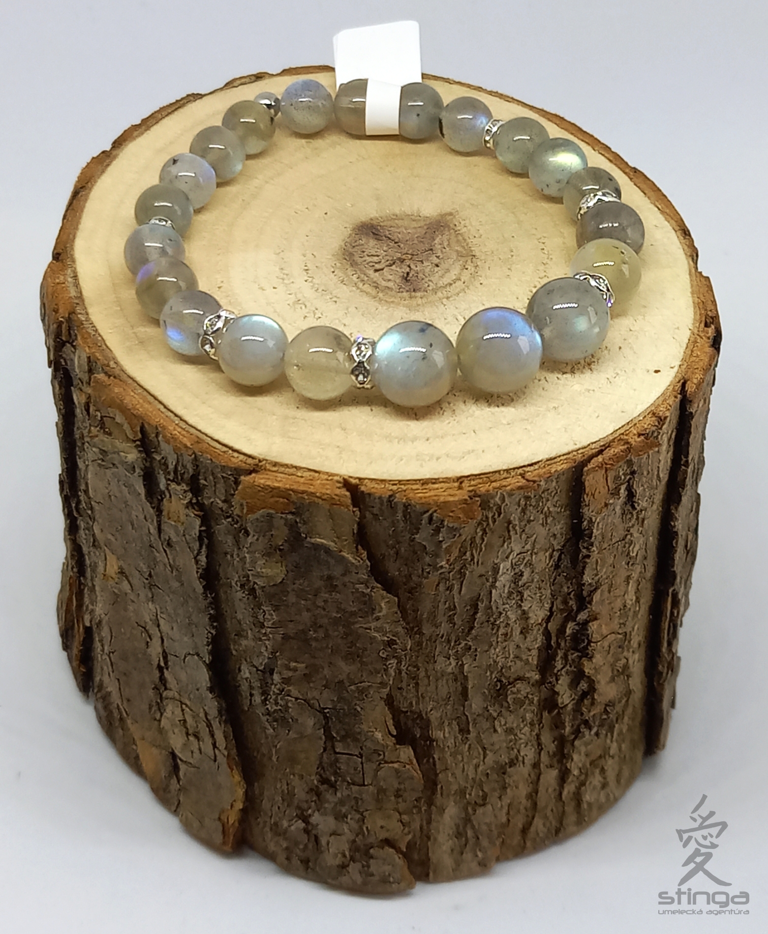 Originálny a nádherný náramok z labradoritu je zdobený štrasovými rondelkami a guličkou z chirurgickej ocele