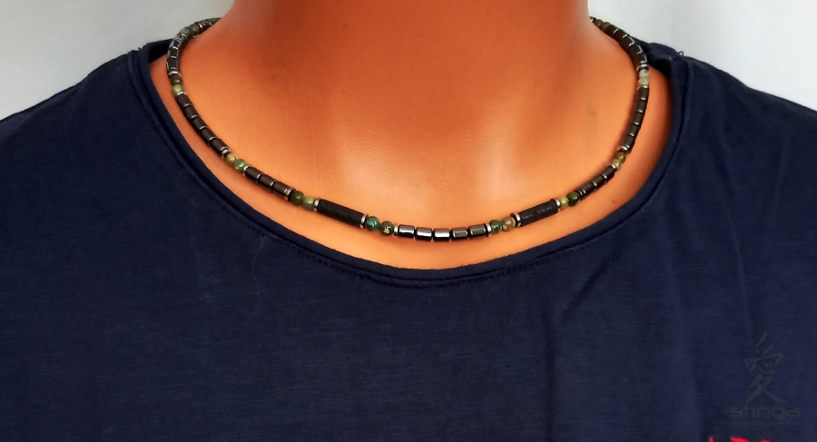 Pánsky náhrdelník v kombinácii s viacerými minerálmi. Náhrdelník je vyrobený na pevnej kovovej strunke so zapínaním z chirurgickej ocele